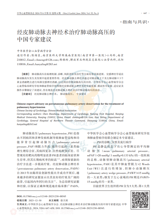 2024年6月21日,《中华心血管病杂志》指南解读会在沈阳成功举办。为总结研究证据和经验,以保证正确和规范地临床推广PADN,中华医学会心血管病学分会心血管临床研究学组和肺血管病学组共同联合制定该建议。会上,专家学者对《经皮肺动脉去神经术PADN治疗肺动脉高压的中国专家建议》进行专业解读和学术讨论,建议的正式发布、制定与推广对临床具有重要意义,也将为广大患者带来更多获益!(点击文末“阅读全文”,下载原文PDF)