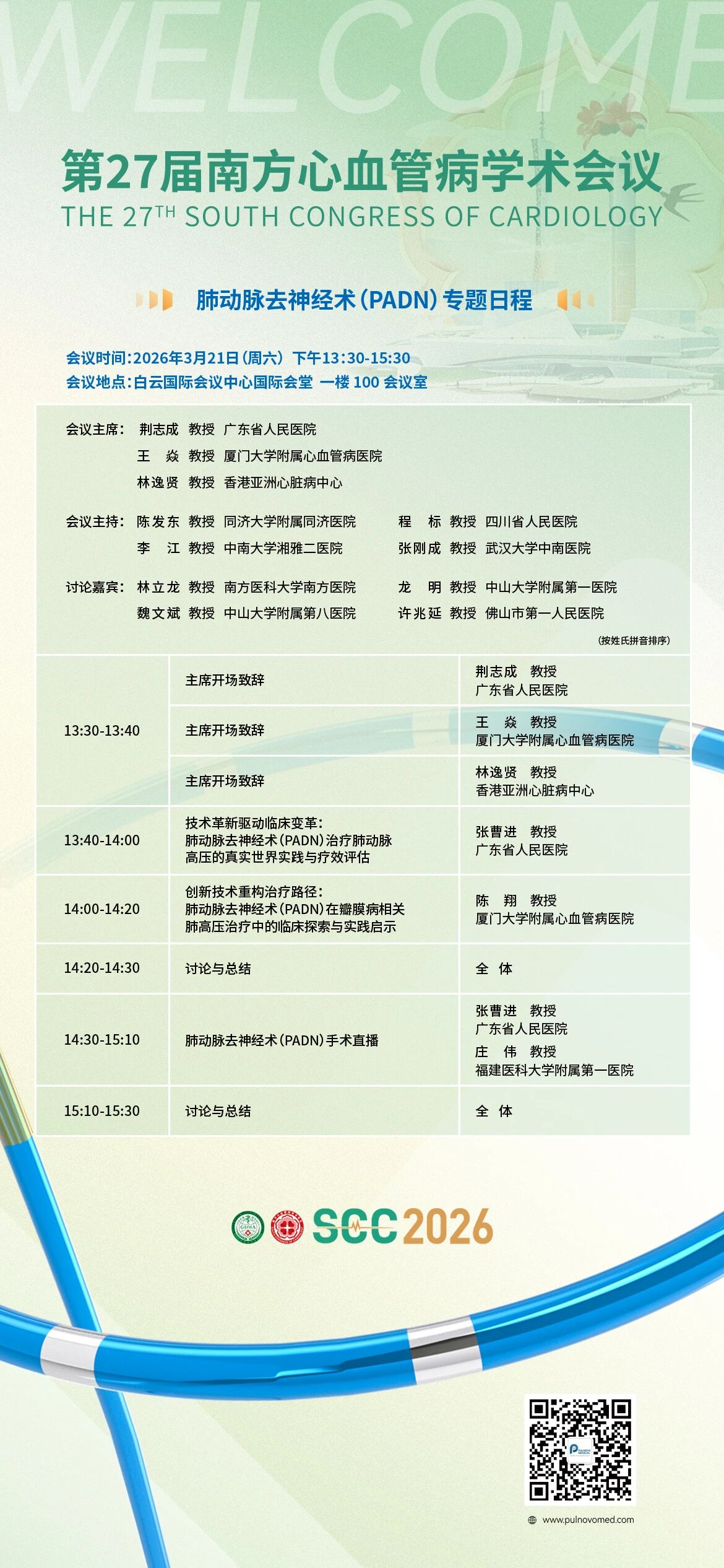 第 27 届南方心血管病学术会议将于 2026 年 3 月 19 日 —22 日在广州隆重召开,帕母医疗将亮相本次盛会,并于3月21日(周六)13:30-15:30,在会议中心1楼【100会议室】举办“PADN专题会”。